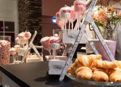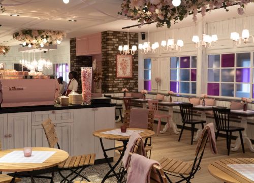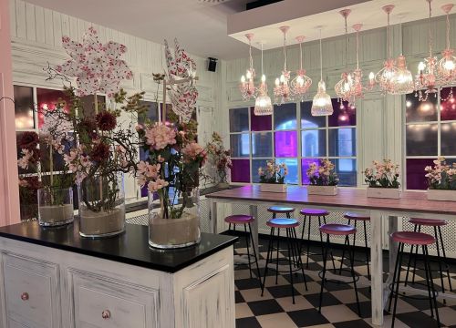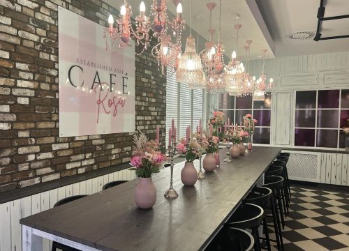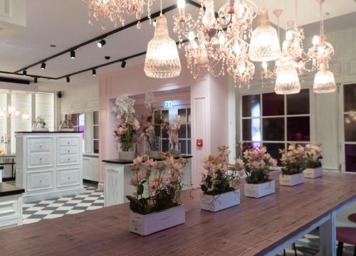 Det bliver en rigtig eyecatcher: Med rosafarvede krystallamper og -lysekroner, rosafarvede vægge og døre, rosafarvede dekorelementer, med en rosafarvet flower wall og naturligvis mange rosafarvede retter serveret på rosafarvet service. Og glassenes farve? Ja, rosa naturligvis. Bliver det kitschig? Nej, det bliver fortryllende og vil begejstre vores gæster. Men tag selv et kig og få et første indtryk.
