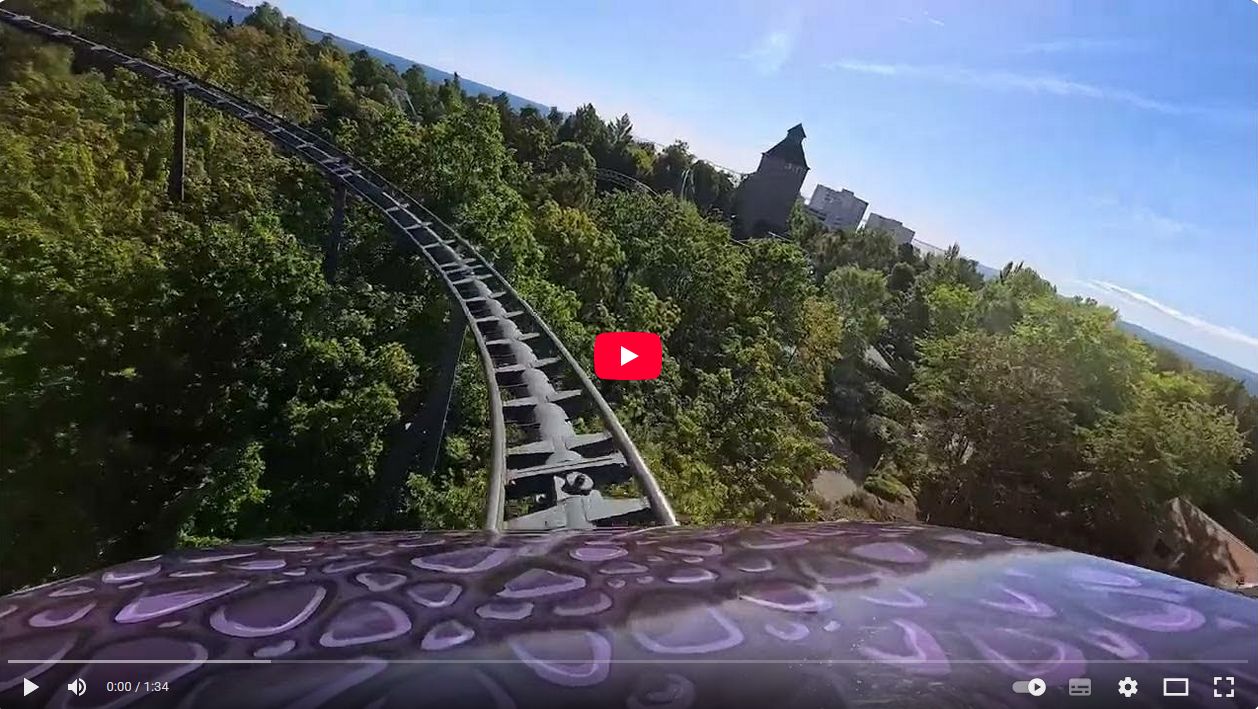 Rasante Achterbahn mit steilen Abfahrten, Überkopffahrt, Dunkelstrecken mit Licht- , Ton- und starken Geräuscheffekten und starker Bremswirkung.