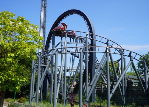 Rasante Achterbahn mit steilen Abfahrten, schnellen Richtungswechseln und starker Bremswirkung.