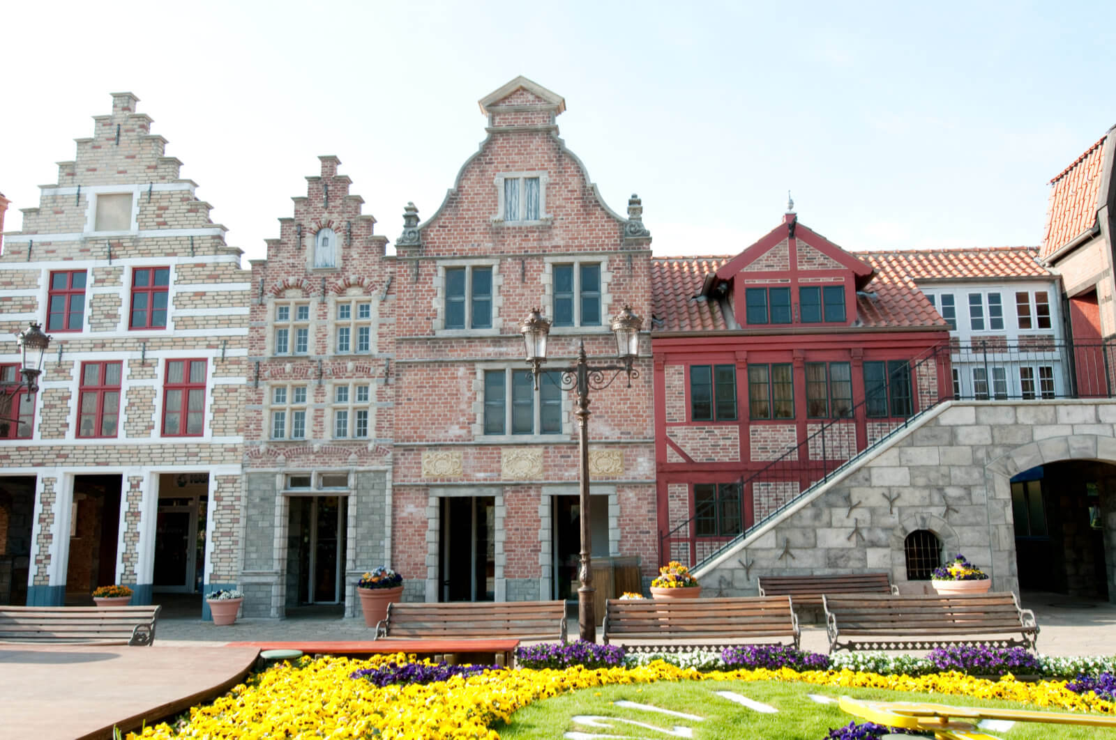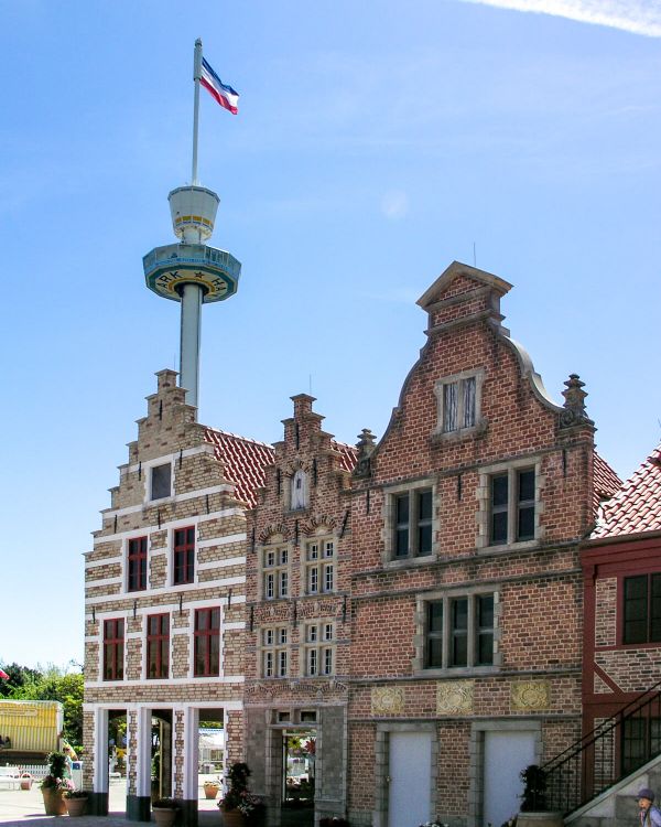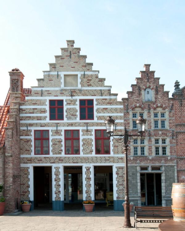 The buildings are located around the large market square in Bruges. In 1996 cars were banned from the square. It is known for its medieval-style houses which were later restored in the style of the Hanseatic League. The large belfry - also called Bleifried - is visible from anywhere and dominates the market square.